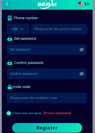 First, launch the 92PAK app or visit their website. You’ll see a registration screen like the one shown above.